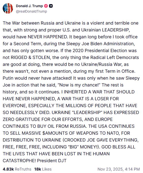 Η δήλωσε αυτή έγινε λιγότερο από 24 ώρες έπειτα από προηγούμενη ανάρτησή του, στην οποία επέκρινε την ουκρανική ηγεσία επειδή, όπως είπε, έδειξε «μηδενική ευγνωμοσύνη» προς τις ΗΠΑ για τις προσπάθειες που καταβάλλουν για τον τερματισμό της σύγκρουσης.