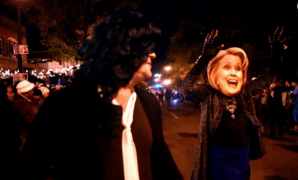 Μια άλλη ντραγκ κουίν φορούσε μια μάσκα χαμογελαστής Κλίντον και έσφιγγε το χέρι περαστικών ή θεατών στη γειτονιά Dupont Circle στη βορειοδυτική Ουάσινγκτον.
