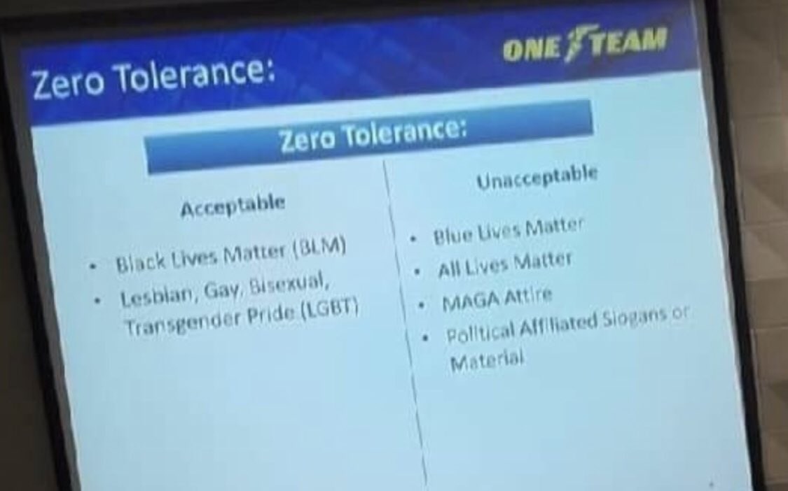 Μια φωτογραφία, που φαίνεται ότι τραβήχθηκε κατά τη διάρκεια μιας εσωτερικής ενημέρωσης στην Goodyear έχει κάνει τον γύρο του διαδικτύου. Δείχνει την παρουσίαση που έγινε στους εργαζομένους για το ποια «μηνύματα» και συνθήματα μπορούν να χρησιμοποιούν στο χώρο εργασίας τους. Στην κατηγορία των «αποδεκτών» είναι τα Black Lives Matter («Οι ζωές των μαύρων μετρούν») και ΛΟΑΔ. Αντιθέτως, θεωρούνται απαράδεκτα τα συνθήματα Blue Lives Matter (κίνημα υπέρ της αστυνομίας) και All Lives Matter («Όλες οι ζωές μετρούν», το χρησιμοποιούν οι υποστηρικτές του Τραμπ σε αντιδιαστολή προς το κίνημα Black Lives Matter) καθώς επίσης και τα ενδύματα με το σύνθημα MAGA του Τραμπ ή οποιοδήποτε άλλο πολιτικό μήνυμα.