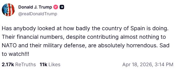 «Έχει κοιτάξει κανείς πόσο άσχημα τα πηγαίνει η χώρα της Ισπανίας; Τα οικονομικά τους νούμερα, παρά το γεγονός ότι δεν συνεισφέρουν σχεδόν τίποτα στο ΝΑΤΟ και τη στρατιωτική του άμυνα, είναι απολύτως φρικτά. Θλιβερό να το βλέπεις!», έγραψε χαρακτηριστικά.