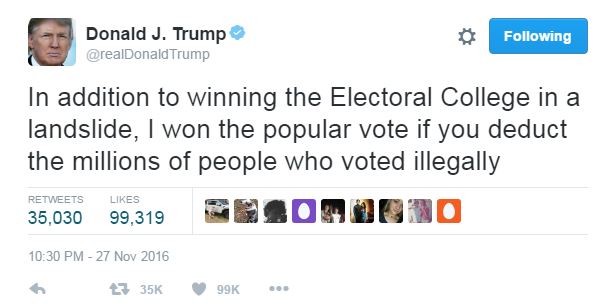“Eκτός από το ό,τι κέρδισα το Εκλεκτορικό Κολλέγιο, με εκπληκτική πλειοψηφία, κέρδισα και τη λαϊκή ψήφο αν αφαιρέσεις τα εκατομμύρια ανθρώπων που ψήφισαν παράνομα” ανέφερε ο Ντόναλντ Τραμπ σε μήνυμά του στο Tweeter, ξεσηκώνοντας θύελλα αντιδράσεων στις ΗΠΑ.