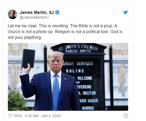 Ο Τραμπ δίχασε για άλλη μια φορά με την απόφασή του να πάει μετά την ομιλία του στον Λευκό Οίκο, στην Επισκοπική Εκκλησία του Saint John, όπου και φωτογραφήθηκε κρατώντας την Βίβλο, ενώ λίγο πριν μιλούσε για στρατιωτική αντιμετώπιση των διαδηλώσεων και των ταραχών στη χώρα. Ο Πρόεδρος των ΗΠΑ, τράβηξε αρκετές φωτογραφίες, τόσο μόνος όσο και με μερικά άτομα από το προσωπικό του. Αρκετοί εξοργίστηκαν από την απόφασή του, ενώ κατά του Τραμπ καταφέρθηκε και ο ιερέας της εκκλησίας. Όπως ανέφερε ο ιερέας η εθνοφρουρά και άνδρες των μυστικών υπηρεσιών χρησιμοποίησαν δακρυγόνα και πλαστικές σφαίρες για να διαλύσουν τους διαδηλωτές, ώστε ο Τραμπ να μπορέσει να πάει περπατώντας ως την εκκλησία που απέχει περίπου ένα μίλι από τον Λευκό Οίκο. Η επίσκοπος Mariann Budde τόνισε ότι στέκονται στο πλευρό όσων θέλουν δικαιοσύνη για τον θάνατο του Τζορτζ Φλόιντ. “Δεν με ενημέρωσαν ούτε από το τηλέφωνο ότι θα εκκένωναν την περιοχή με δακρυγόνα και ότι θα χρησιμοποιούσαν τις εκκλησίας μας σαν… αξεσουάρ. Θα είμαι ξεκάθαρη. Ο Πρόεδρος χρησιμοποίησε την Βίβλο, το πιο ιερό κείμενο της παράδοσής μας και μια εκκλησία της επισκοπής μου χρησιμοποιήθηκε χωρίς άδεια ως φόντο για ένα αντίθετο μήνυμα από τις διδαχές του Ιησού” δήλωσε στο CNN. Ο επίσκοπος Michael Curry κατηγόρησε τον Τραμπ ότι χρησιμοποίησε την εκκλησία και την Βίβλο για ίδιους πολιτικούς σκοπούς.