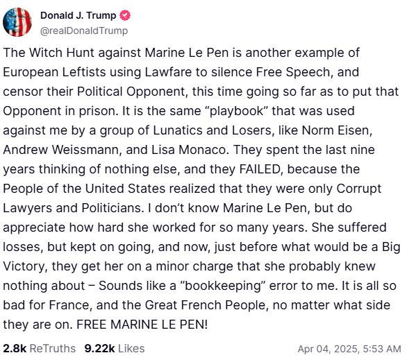 Στην ανάρτησή του στο Truth Social, ο Τραμπ έγραψε: «Το κυνήγι μαγισσών κατά της Μαρίν Λεπέν είναι ένα ακόμη παράδειγμα των Ευρωπαίων αριστερών που χρησιμοποιούν τη νομοθεσία για να φιμώσουν την ελευθερία του λόγου και να λογοκρίνουν τον πολιτικό τους αντίπαλο, όπου αυτή τη φορά έφτασαν στο σημείο να βάλουν τον αντίπαλο στη φυλακή».