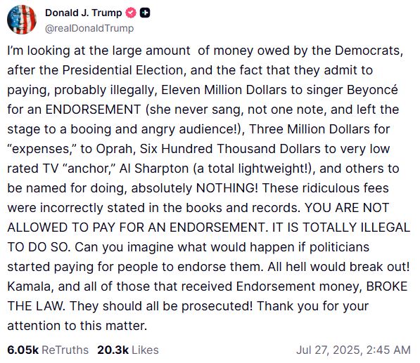 Ο Τραμπ, μέσω του Truth Social το βράδυ του Σαββάτου, καταφέρθηκε εναντίον της καμπάνιας των Δημοκρατικών, υποστηρίζοντας πως πραγματοποίησε πληρωμές σε διασημότητες, κάτι που –κατά την άποψή του– παραβιάζει τη νομοθεσία περί εκλογικών εξόδων.