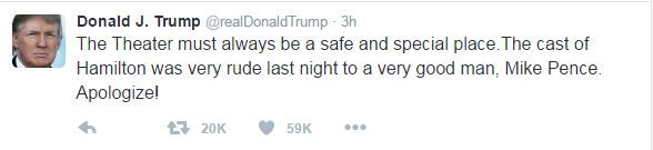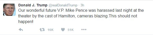 “Ο θαυμάσιος μελλοντικός αντιπρόεδρος Μάικ Πενς παρενοχλήθηκε χθες το βράδυ στο θέατρο από τους ηθοποιούς του Χάμιλτον, με τις κάμερες να αστράφτουν. Αυτό δεν έπρεπε να συμβεί!” συνέχισε.