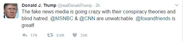“Τα μέσα ενημέρωσης που διασπείρουν ψευδείς πληροφορίες έχουν τρελαθεί με τις θεωρίες συνωμοσίας και το τυφλό μίσος τους” συνέχισε ο Τραμπ στο Twitter, “δείχνοντας” κυρίως το CNN και το MSNBC που “είναι αδύνατον να τα παρακολουθήσεις”. Αντιθέτως, συνεχάρη το συντηρητικό τηλεοπτικό δίκτυο Fox.