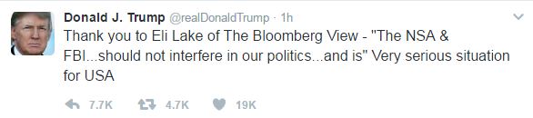 Ο Πρόεδρος κατηγόρησε επίσης ευθέως τις αμερικανικές υπηρεσίες πληροφοριών για τη διαρροή των πληροφοριών, ιδίως την NSA και το FBI. “Οι πληροφορίες δίνονται παράνομα στους κακούς @NYTimes και την @WashingtonPost από την κοινότητα των υπηρεσιών πληροφοριών (NSA και FBI);” ήταν το ερώτημα που έθεσε. Αμέσως μετά έπλεξε το εγκώμιο ενός δημοσιογράφου του Bloomberg επειδή έγραψε ότι “η NSA και το FBI (…) δεν θα έπρεπε να παρεμβαίνουν στην πολιτική μας”.