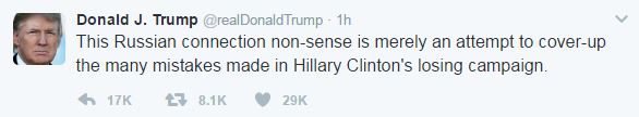 «Αυτή η ιστορία των ρωσικών διασυνδέσεων είναι ένας παραλογισμός, είναι απλώς μια προσπάθεια συγκάλυψης των πολλών λαθών που διέπραξε η ηττημένη προεκλογική εκστρατεία της Χίλαρι Κλίντον» ανέφερε σε μήνυμά του στο Twitter.