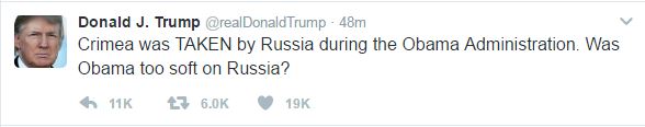 Σε επόμενο μήνυμά του ο Τραμπ υπενθύμισε ότι «η Ρωσία κατέλαβε την Κριμαία» ενώ Πρόεδρος των ΗΠΑ ήταν ο Μπαράκ Ομπάμα και διερωτήθηκε: «Ήταν πολύ ήπιος ο Ομπάμα με τη Ρωσία;».