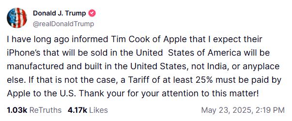«Έχω εδώ και καιρό ενημερώσει τον Τιμ Κουκ της Apple ότι, περιμένω τα iPhone που θα πωλούνται στις ΗΠΑ να κατασκευάζονται και να παρασκευάζονται στις Ηνωμένες Πολιτείες, όχι στην Ινδία ή οπουδήποτε αλλού», έγραψε ο Τραμπ στο Truth Social.