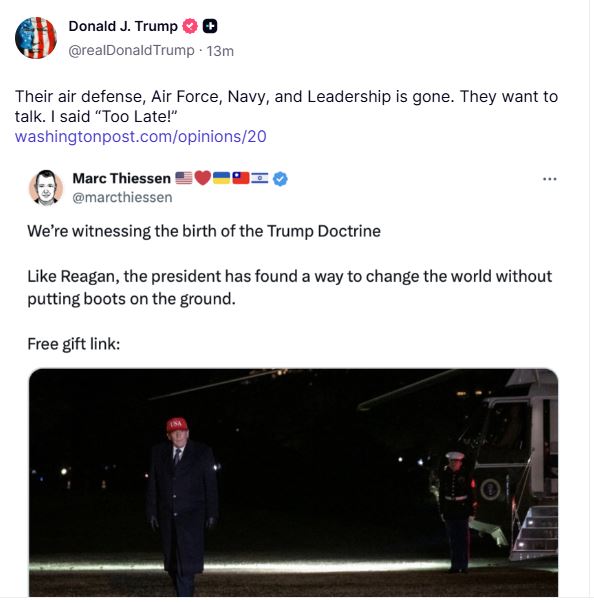«Η αεράμυνά τους, η Πολεμική Αεροπορία, το Ναυτικό και η Ηγεσία τους χάθηκαν. Θέλουν να μιλήσουν. Είπα “Πολύ αργά!”» αναφέρει ο πρόεδρος των ΗΠΑ, Ντόναλντ Τραμπ, στο μήνυμά του στο Truth Social.