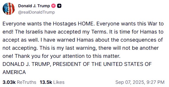 «Όλοι θέλουν οι όμηροι να επιστρέψουν στην ΠΑΤΡΙΔΑ. Όλοι θέλουν να τελειώσει αυτός ο Πόλεμος! Οι Ισραηλινοί αποδέχτηκαν τους όρους μου. Ήρθε η ώρα να τους αποδεχτεί και η Χαμάς. Έχω προειδοποιήσει τη Χαμάς για τις συνέπειες του να μην αποδεχτεί. Αυτή είναι η τελευταία μου προειδοποίηση, δεν θα υπάρξει άλλη! Σας ευχαριστώ για την προσοχή σας σε αυτό το θέμα», έγραψε στο Truth Social ο Τραμπ.