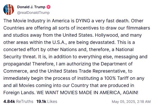 «Άλλες χώρες προσφέρουν κάθε είδους κίνητρα για να τραβήξουν τους σκηνοθέτες και τα στούντιό μας μακριά από τις ΗΠΑ. Το Χόλιγουντ και πολλές άλλες περιοχές εντός των Ηνωμένων Πολιτειών καταστρέφονται. Πρόκειται για μια συντονισμένη προσπάθεια από άλλα Έθνη και, επομένως, για μια απειλή εθνικής ασφάλειας. Είναι, εκτός όλων των άλλων, μήνυμα και προπαγάνδα! Γι’ αυτό εξουσιοδοτώ το υπουργείο Εμπορίου και τον Εμπορικό Αντιπρόσωπο των ΗΠΑ να ξεκινήσουν άμεσα τη διαδικασία για την επιβολή δασμού 100% σε κάθε ταινία που εισέρχεται στη χώρα μας και έχει παραχθεί σε ξένη χώρα. Θέλουμε οι ταινίες να γυρίζονται στην Αμερική, ξανά!», έγραψε χαρακτηριστικά, εξηγώντας την απόφασή του.