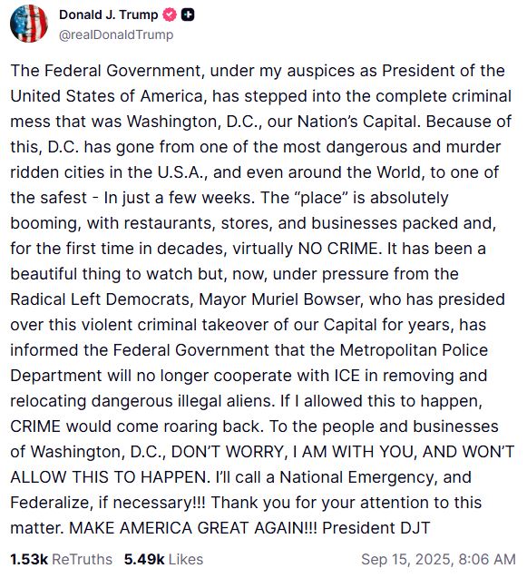 Ο Αμερικανός πρόεδρος Ντόναλντ Τραμπ, δήλωσε σήμερα ότι θα κηρύξει την πρωτεύουσα των ΗΠΑ, Ουάσινγκτον, σε κατάσταση έκτακτης ανάγκης και θα την θέσει υπό ομοσπονδιακό έλεγχο, αφού η δήμαρχος της πόλης, Μιούριελ Μπάουζερ, δήλωσε πως η αστυνομία της δεν θα συνεργασθεί με την Υπηρεσία Μετανάστευσης και Τελωνείων (ICE).