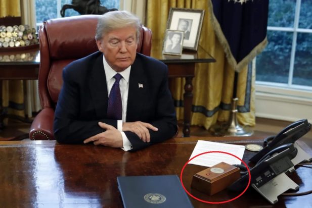 Το διάσημο κουμπί, το οποίο δεν πυροδοτεί πυρηνικά όπως το αντίστοιχο του Κιμ Γιονγκ Ουν, τοποθετημένο μέσα σε ένα ξύλινο κουτί, εντοπίστηκε ξανά στο γραφείο του Τραμπ στο Οβάλ Γραφείο μετά την τελετή ορκωμοσίας του τη Δευτέρα, σύμφωνα με τη Wall Street Journal.