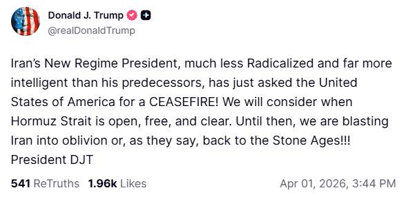 «Θα το εξετάσουμε όταν τα Στενά του Ορμούζ είναι ανοιχτά, ελεύθερα και καθαρά. Μέχρι τότε, ανατινάζουμε το Ιράν στη λήθη ή, όπως λένε, θα το στείλουμε πίσω στη Λίθινη Εποχή!!!».
