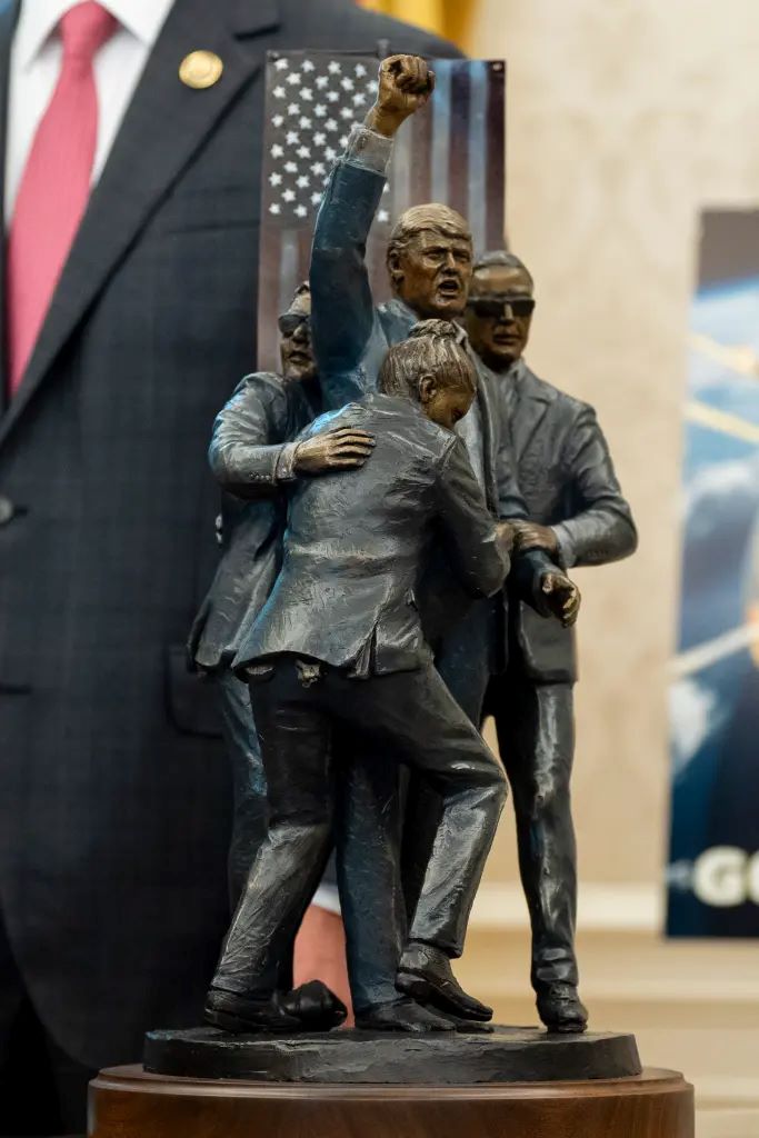 Ο Ντόναλντ Τραμπ συνεχίζει να διαμορφώνει τον Λευκό Οίκο σύμφωνα με τη δική του αισθητική και αφήγηση, προσθέτοντας στο Οβάλ Γραφείο ένα νέο, ιδιαίτερα φορτισμένο πολιτικά έργο τέχνης: ένα γλυπτό που απεικονίζει τη δραματική στιγμή λίγο μετά την αποτυχημένη απόπειρα δολοφονίας του τον Ιούλιο του 2024, στο Μπάτλερ της Πενσυλβάνια.
