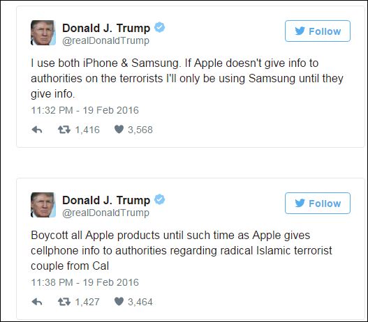 Σε μποϊκοτάζ των προϊόντων της Apple ως απάντηση στην έως τώρα αρνητική της στάση στο δικαστική διαταγή του FBI να ξεκλειδώσει με ειδικό software το iPhone του μακελάρη του Σαν Μπερναντίνο κάλεσε τους Αμερικανούς ο Ντόναλντ Τραμπ.