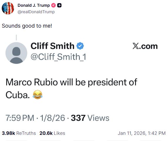 Ο Αμερικανός πρόεδρος αναδημοσίευσε ακόμη μήνυμα χθες Κυριακή που αναφέρει ότι ο υπουργός Εξωτερικών του, Μάρκο Ρούμπιο, γιος κουβανών μεταναστών στις ΗΠΑ, θα μπορούσε να γίνει πρόεδρος της νήσου της Καραϊβικής, συνοδεύοντας με το σχόλιο «καλό μου ακούγεται αυτό!»