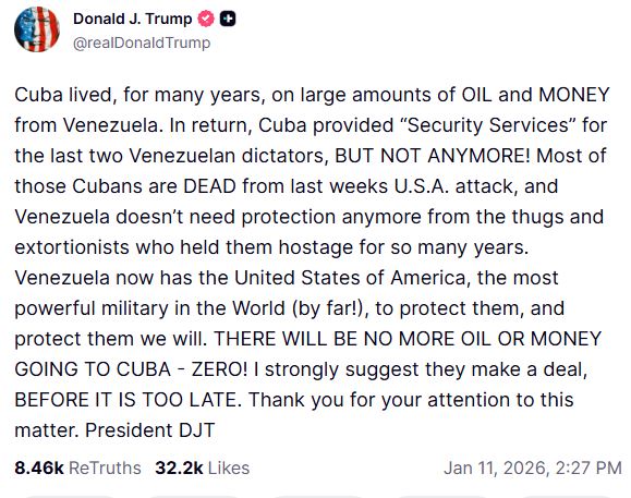 «Η Κούβα ζούσε, για πολλά χρόνια, χάρη σε μεγάλες ποσότητες πετρελαίου και χρημάτων από τη Βενεζουέλα. Σε αντάλλαγμα η Κούβα παρείχε ‘υπηρεσίες ασφαλείας’ στους δυο τελευταίους δικτάτορες της Βενεζουέλας, αλλά αυτό τέλειωσε», υποστήριξε ο κ. Τραμπ.