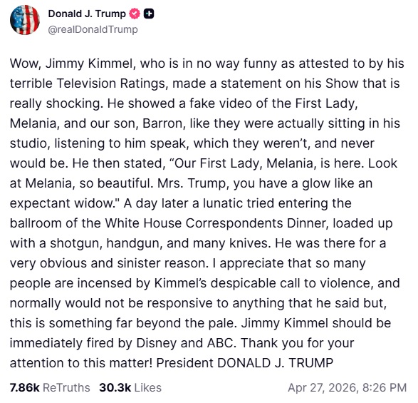 «Το παράκανε. Ο Τζίμι Κίμελ πρέπει να απολυθεί αμέσως από την Disney και το ABC», έγραψε στην πλατφόρμα του ο Τραμπ, λίγη ώρα αφότου και η Μελάνια κάλεσε το δίκτυο «να πάρει θέση».