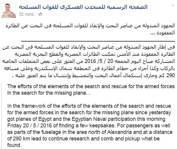 Ο εκπρόσωπος Τύπου του Αιγυπτιακού Στρατού, Μοχάμεντ Σαμίρ, επισημαίνει σε ανάρτησή του στο facebook, ότι βρέθηκαν τμήματα της Ατράκτου του αεροσκάφους της EgyptAir.