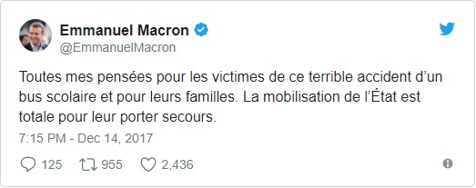 Ο πρωθυπουργός Edouard Philippe έφθασε λίγα λεπτά αργότερα στο σημείο της τραγωδίας ενώ σε μήνυμά του ο Emmanuel Macron τόνισε ότι: “Η σκέψη μου είναι στα θύματα αυτής της τραγωδίας και στις οικογένειες τους. Ο κρατικός μηχανισμός βρίσκεται σε ετοιμότητα για τη στήριξη τους”.