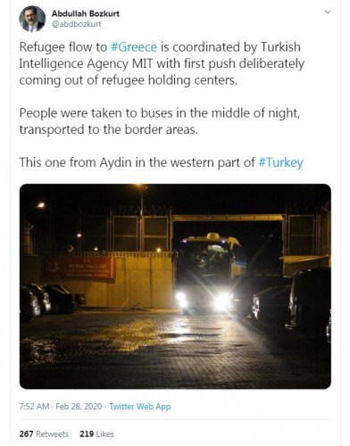 Σε άλλη ανάρτησή του, ο ίδιος δημοσιογράφος αναφέρει: «Η ροή προσφύγων προς την Ελλάδα συντονίζεται από την ΜΙΤ, την τουρκική υπηρεσία πληροφοριών, με την πρώτη ώθηση να γίνεται σκόπιμα από τα κέντρα κράτησης προσφύγων. Επιβίβασαν ανθρώπους σε λεωφορεία στο μέσο της νύχτας και μεταφέρθηκαν σε συνοριακές περιοχές».