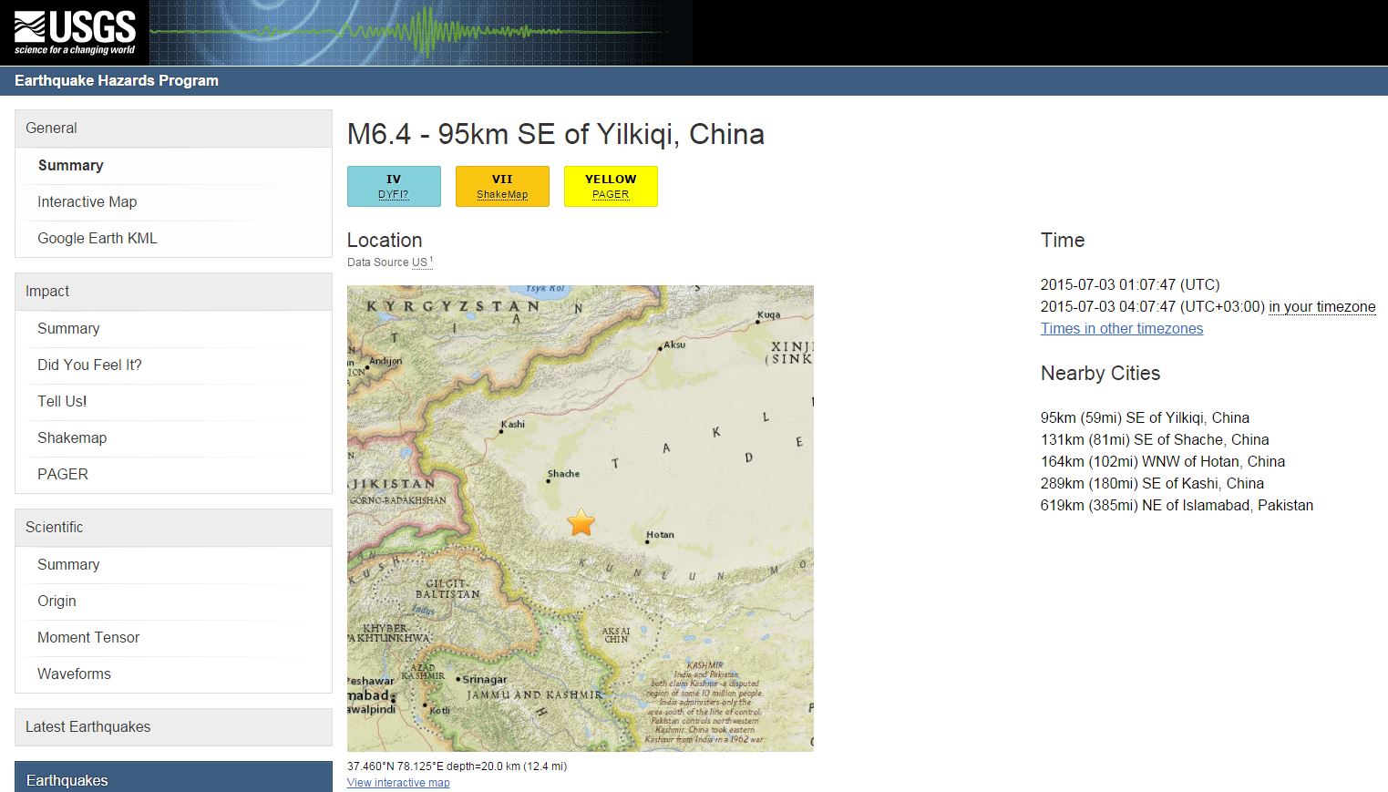Ο σεισμός σημειώθηκε στην άκρη της ερήμου Τακλιμακάν, μια τεράστια ακατοίκητη έκταση, στις 09.07 τοπική ώρα (04.07 ώρα Ελλάδος) 164 χλμ. βορειοδυτικά της πόλης Χοτάν και 131 χλμ. νοτιοανατολικά της Σάτσε -Γιαρκάντ στη γλώσσα των Ουιγούρων- και σε βάθος 20 χλμ. σύμφωνα με το USGS.