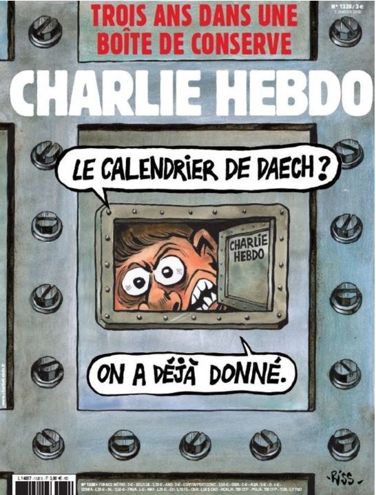 Στις 7 Ιανουαρίου συμπληρώνονται τρία χρόνια από την αιματηρή και πολύνεκρη επίθεση τζιχαντιστών του Ισλαμικού Κράτους (ISIS) στα γραφεία του περιοδικού Charlie Hebdo. Οι συντάκτες του περιοδικού δημιούργησαν ένα επετειακό τεύχος με ένα εξώφυλλο όλο νόημα και συμβολισμούς.«Τρία χρόνια μέσα σε μια κονσέρβα», είναι ο τίτλος του πρωτοσέλιδου με τον πρωταγωνιστή του σκίτσου, που είναι ένας από τους εργαζόμενους του περιοδικού, να φωνάζει: «το ημερολόγιο του ISIS