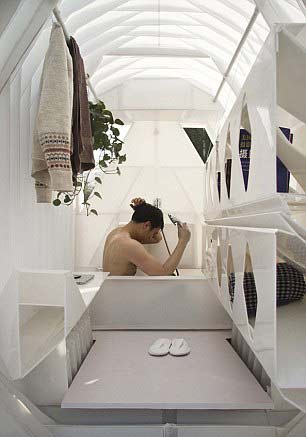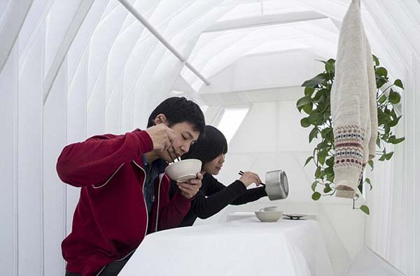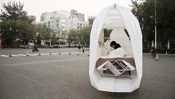 Το κρεβάτι μετατρέπεται σε τραπέζι ή πάγκο (και το αντίστροφο), προσφέροντας ικανοποιητική ευελιξία στους χρήστες ανάλογα με τις ανάγκες τους. Η κατασκευή είναι φτιαγμένη από διαφανές πλαστικό που επιτρέπει στο φυσικό φως να μπει στο εσωτερικό του «σπιτιού» κατά τη διάρκεια της μέρας αλλά και το βράδυ να φωτίζεται ο χώρος από τα φώτα του δρόμου.