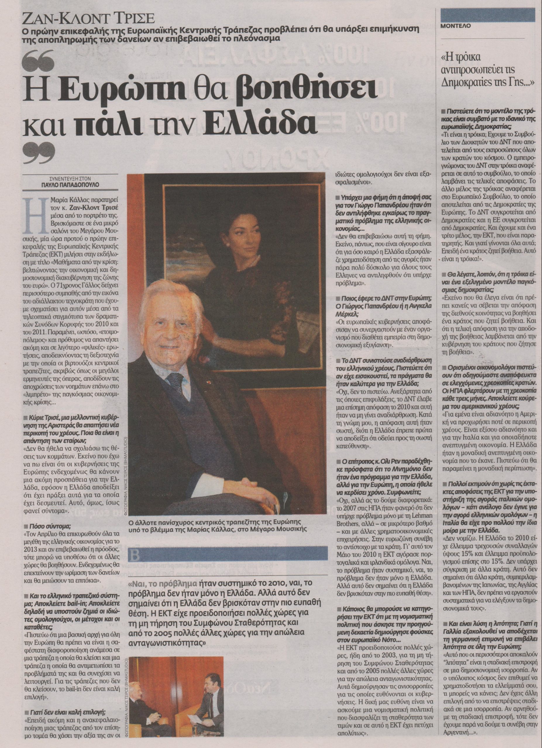 Η Μαρία Κάλλας παρατηρεί τον Ζαν-Κλοντ Τρισέ μέσα από το πορτρέτο της. Βρισκόμαστε σε ένα μικρό σαλόνι του Μεγάρου Μουσικής, μία ώρα προτού ο πρώην επικεφαλής της Ευρωπαϊκής Κεντρικής Τράπεζας (ΕΚΤ) μιλήσει στην εκδήλωση, με τίτλο «Μαθήματα από την κρίση: Βελτιώνοντας την οικονομική και δημοσιονομική διακυβέρνησης της ζώνης του ευρώ».