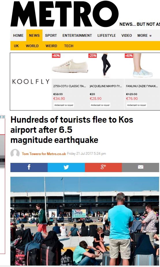 Πολλοί είναι οι τουρίστες που εγκαταλείπουν τα τουρκικά και ελληνικά τουριστικά θέρετρα, καθώς διέκοψαν τις διακοπές τους μετά τον φονικό σεισμό που έπληξε την Κω , όπως αναφέρει η Daily Mail. Αντίστοιχα ρεπορτάζ δημοσιεύονται και στο BBC, τη Sun και τη Metro.