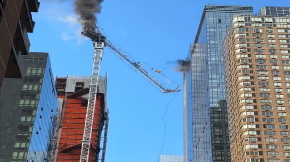 A crane near 10th Ave & 41st St is on fire. I just witnessed a portion of the structure break off and fall to the ground. Emergency responders are now blocking roadways nearby to assist with the situation. #Manhattan #nyc pic.twitter.com/XJnctxImx7