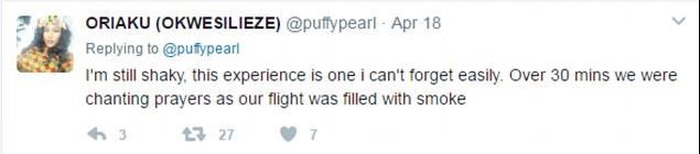 Τον τρόμο έζησαν 53 επιβάτες ενός αεροσκάφους που εκτελούσε πτήση από το Πορτ Χαρκούρ με προορισμό το Λάγος της Νιγηρίας όταν η καμπίνα του αεροπλάνου γέμισε με καπνό.Σύμφωνα με τη Daily Mail, ένας από τους κινητήρες του αεροσκάφους τυλίχθηκε στις φλόγες λίγο μετά την απογείωση του.Στο βίντεο ακούγονται οι επιβάτες να προσεύχονται και να φωνάζουν έντρομοι την ώρα που η καμπίνα είχε γεμίσει από καπνό.«Γλίτωσα από τον θάνατο. Ακόμα τρέμω, δεν μπορώ να ξεχάσω αυτή την εμπειρία. Για μισή ώρα προσευχόμασταν καθώς το αεροπλάνο γέμιζε καπνό» έγραψε μία από τους επιβάτες στον λογαριασμό της στο Twitter.