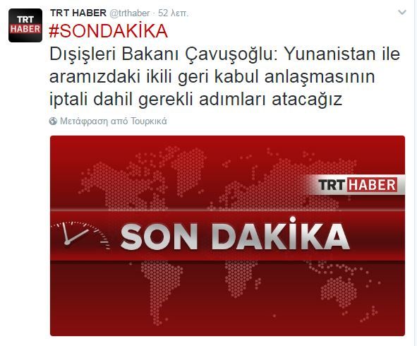 Ο Τούρκος υπουργός Εξωτερικών, Μεβλούτ Τσαβούσογλου, δήλωσε πως η Άγκυρα θα λάβει τα απαραίτητα μέτρα που περιλαμβάνουν την ακύρωση της διμερούς συμφωνίας με την Ελλάδα για την επανεισδοχή μεταναστών, μετέδωσε σήμερα μέσω του Twitter το ραδιοτηλεοπτικό δίκτυο TRT Haber.