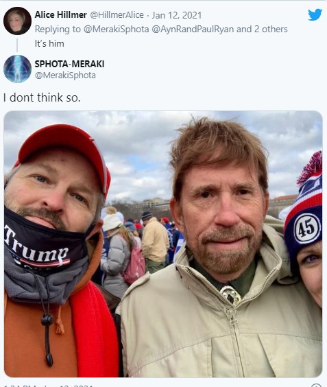 Η φωτογραφία του άνδρα που μοιάζει στον γνωστό ηθοποιό δημοσιεύθηκε στο Twitter. “Πρόσφατα έμαθα ότι ένας σωσίας του Τσακ Νόρις βρέθηκε στα επεισόδια που έγιναν στο Καπιτώλιο. Δεν ήμουν εγώ και δεν ήμουν εκεί. Δεν υπάρχει περιθώριο για βία οποιουδήποτε είδους στην κοινωνία μας. Είμαι και πάντα θα είμαι υπέρ του νόμου και της τάξης” έγραψε σε ένα tweet o 80χρονος ηθοποιός.