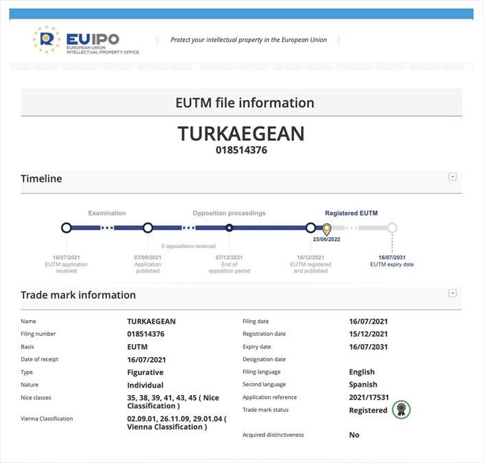 Σε έγγραφο που αναρτήθηκε στην EUTM, αρμόδια ευρωπαϊκή υπηρεσία για την κατοχύρωση εμπορικών σημάτων και δημοσίευσε η Ναυτεμπορική φαίνεται ότι ο όρος έχει γίνει δεκτός, από τις 15 Δεκεμβρίου του 2021, με ημερομηνία λήξης την 16 Ιουλίου του 2031.