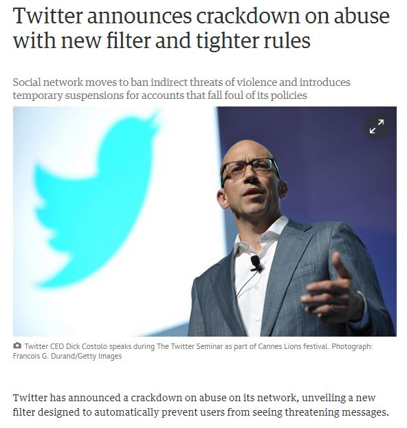 Επίσης, η εταιρεία κοινωνικής δικτύωσης ανακοίνωσε ότι θα προχωρήσει στην απαγόρευση έμμεσων μηνυμάτων με προσβλητικό περιεχόμενο. Αυτή η ανακοίνωση, που αφορά τα χαρακτηριστικά ασφαλείας της υπηρεσίας, έρχεται μετά από ένα υπόμνημα που διέρρευσε στο διαδίκτυο ο διευθύνων σύμβουλος της εταιρείας, Ντικ Κοστόλο, στο οποίο, χρησιμοποιώντας ειλικρινή γλώσσα, τόνισε την αποτυχία του Twitter να αποτρέψει τα περιστατικά παρενόχλησης στην ιστοσελίδα του.