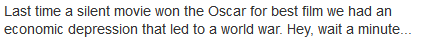 Ένας χρήστης του Twitter αντιλήφθηκε πως η τελευταία φορά που είχε κερδίσει μια βουβή ταινία το Όσκαρ της καλύτερης ταινίας ήταν η χρονιά της μεγάλης παγκόσμιας ύφεσης στην Αμερική… Το 1929 λοιπόν η ταινία “Wings” είχε κερδίσει το βραβείο της καλύτερης ταινίας.