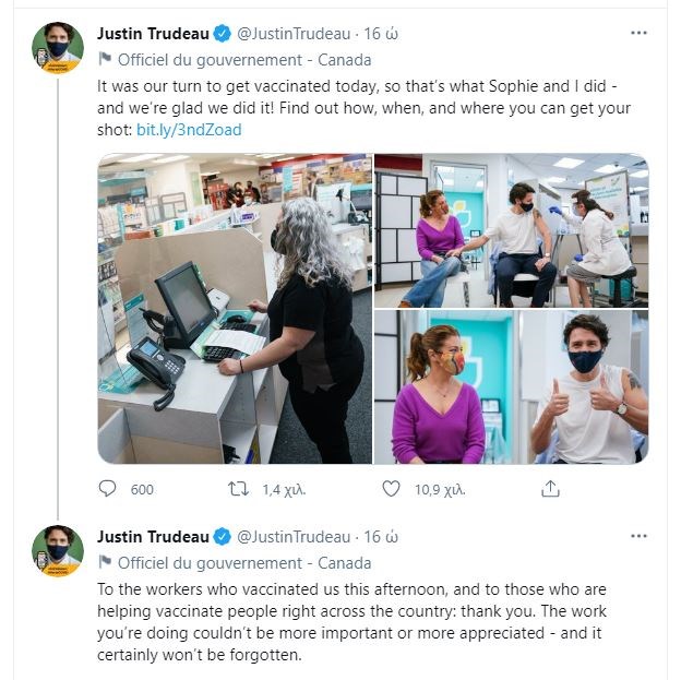 Σε φαρμακείο στην Οτάβα του Καναδά εμβολιάστηκαν ο πρωθυπουργός της χώρας Τζάστιν Τριντό και η σύζυγός του Σόφι Γκρεγκουάρ Τριντό. Το ζευγάρι έλαβε την πρώτη δόση του εμβολίου της AstraZeneca, ενώ ο πρωθυπουργός ανέβασε φωτογραφίες από τον εμβολιασμό του στα social media. Αυτό που προσέλκυσε την προσοχή είναι το τατουάζ στο αριστερό του μπράτσο εκεί όπου ο Τριντό δέχτηκε το εμβόλιο.