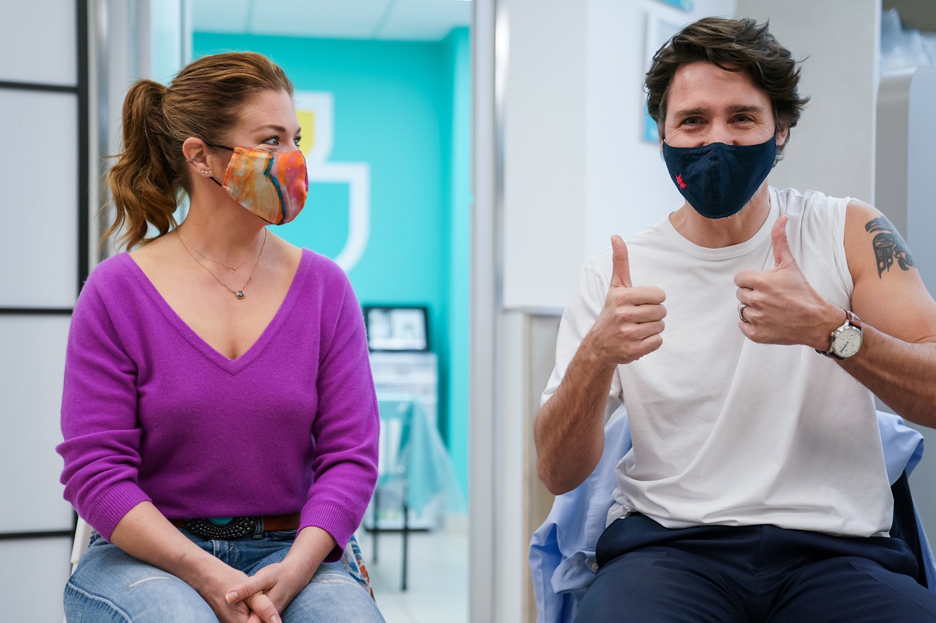 Φαίνεται πως είναι ένα τατουάζ Αυτόχθονων, ενώ τη στιγμή που η φαρμακοποιός Ζαϊνέμπ Χασάν είναι έτοιμη να του κάνει το εμβόλιο, ο Τριντό αστειευόμενος ζήτησε από τη σύζυγό του να του κρατά το δεξί του χέρι.