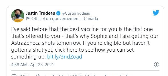 Σημειώνεται πως ο πρωθυπουργός είχε πει ότι θα κάνει το εμβόλιο της AstraZeneca και αυτός και η σύζυγός του. σημειώνοντας πως “είχα πει και παλαιότερα ότι το καλύτερο εμβόλιο για εσένα είναι αυτό που προσφέρεται πρώτο. Γι’ αυτό η Σόφι κι εγώ θα κάνουμε της AstraZeneca.
