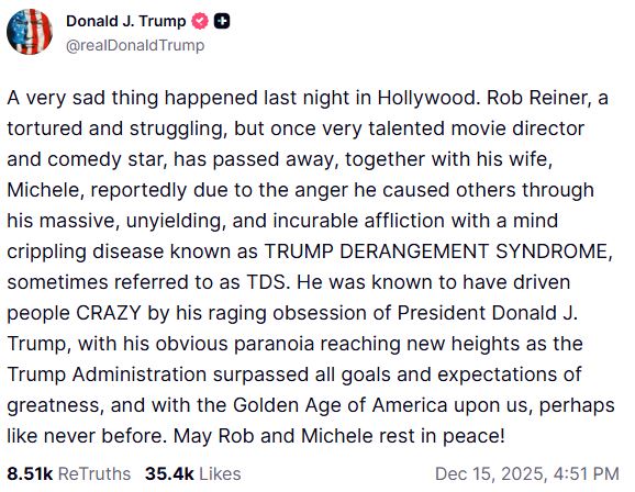 Ο Κίμελ αναφέρθηκε σε ανάρτηση του Τραμπ στο Truth Social, όπου ο Τραμπ έγραψε: «Σημειώθηκε ένα πολύ λυπηρό γεγονός χθες το βράδυ στο Χόλιγουντ. Ο Ρομπ Ράινερ, ένας ταλαιπωρημένος αλλά κάποτε πολύ ταλαντούχος σκηνοθέτης και σταρ της κωμωδίας, πέθανε μαζί με τη σύζυγό του, Μισέλ, φέρεται λόγω του θυμού που προκάλεσε στους άλλους μέσω της μαζικής, ακατάβλητης και ανίατης πάθησης με ένα νοητικά παραλυτικό σύνδρομο γνωστό ως Σύνδρομο Διαταραχής Τραμπ, μερικές φορές αναφερόμενο ως TDS».