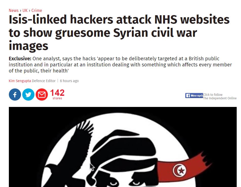 Χάκερ που φέρεται να συνδέονται με το Ισλαμικό Κράτος εξαπέλυσαν κυβερνοεπίθεση σε ιστοσελίδες του βρετανικού Εθνικού Συστήματος Υγείας (NHS) σε αντίποινα όπως ανέφεραν της «επιθετικότητας της Δύσης στη Μέση Ανατολή», σύμφωνα με τον Independent.