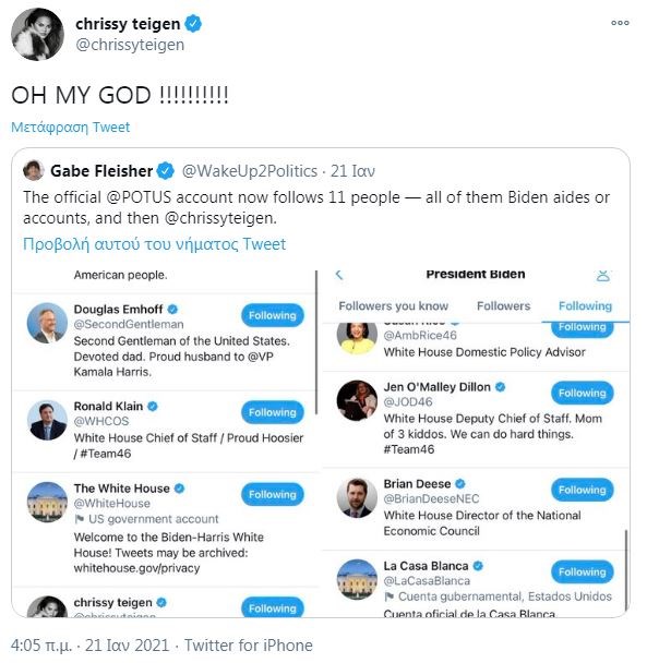 Ο νέος πρόεδρος των ΗΠΑ, Τζο Μπάιντεν έχει πλέον τον έλεγχο του επίσημου λογαριασμού στο Twitter @POTUS, (President of The United States) τώρα που ο προηγούμενος κάτοχός του έχει αποσυρθεί στο θέρετρο Μαρ-α-Λάγκο, στο Παλμ Σπρινγκς.