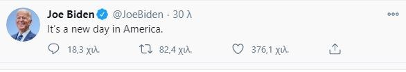 “Είναι μία καινούργια ημέρα στην Αμερική” έγραψε ο Μπάιντεν, στιγμές μετά την αποχαιρετιστήρια ομιλία του Ντόναλντ Τραμπ και την αναχώρησή του για τη Φλόριντα.