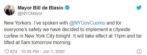 «Μίλησα με τον κυβερνήτη (της Πολιτείας της Νέας Υόρκης) Άντριου Κουόμο και για την ασφάλεια όλων, αποφασίσαμε να εφαρμόσουμε απαγόρευση της κυκλοφορίας στην πόλη απόψε: θα ξεκινήσει στις 23.00 και θα αρθεί στις 5 το πρωί», τοπική ώρα, ανέφερε ο δήμαρχος.