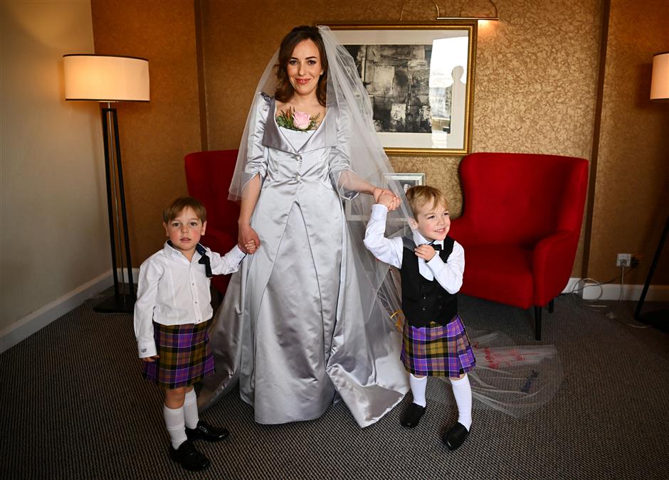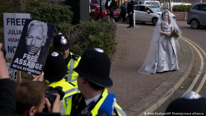Η νύφη έφθασε στη φυλακή συνοδευόμενη από τους δύο γιους που απέκτησε με τον Ασάνζ, όταν αυτός ζούσε στην πρεσβεία του Ισημερινού στο Λονδίνο. Στο πέπλο της ήταν κεντημένα μηνύματα φίλων του ιδρυτή των WikiLeaks.