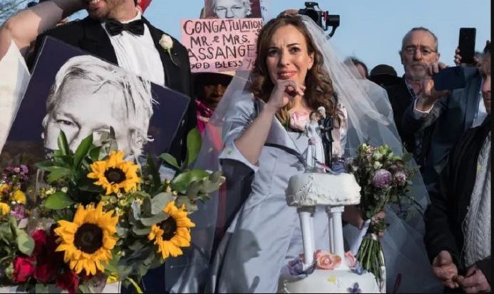 Η νύφη έφθασε στη φυλακή συνοδευόμενη από τους δύο γιους που απέκτησε με τον Ασάνζ, όταν αυτός ζούσε στην πρεσβεία του Ισημερινού στο Λονδίνο. Στο πέπλο της ήταν κεντημένα μηνύματα φίλων του ιδρυτή των WikiLeaks.